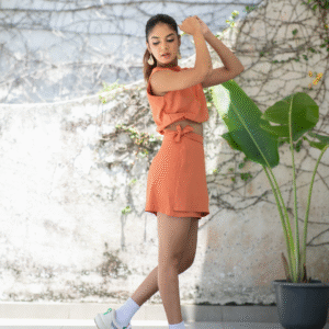 Turn heads with Ayla, a burnt orange co-ord set that blends bold color with breezy comfort. Featuring a mock-wrap skirt with a tie-up belt and a sleeveless crop top with an elastic hem, this set flatters with ease. The soft cotton fabric keeps things cool and breathable in tropical weather. With a back opening for easy wear, it’s your perfect pick for sunshine days.